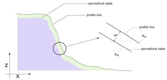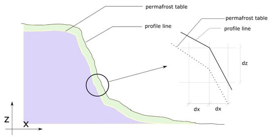 - permafrost table: the thawing face of the permafrost. During the winter, the line is assumed to collide with the profile line. The difference between the beach line and the permafrost table is the thawing depth.