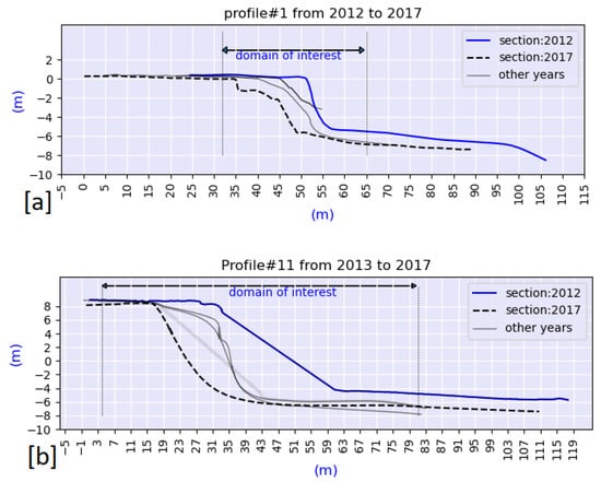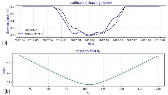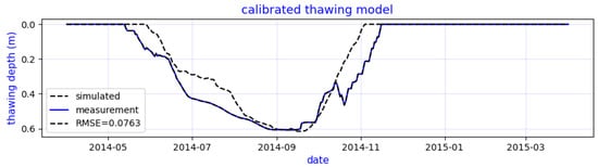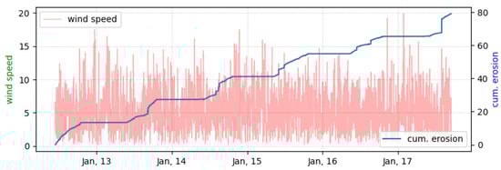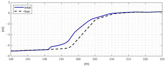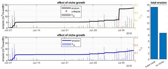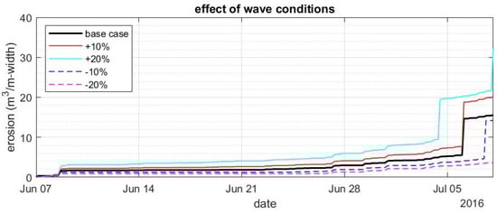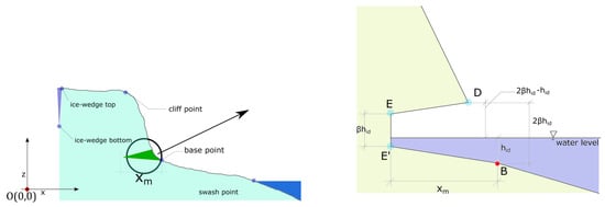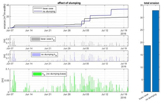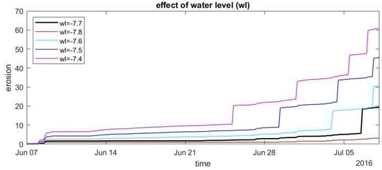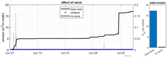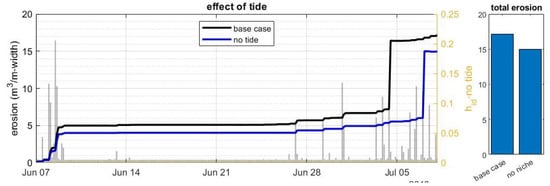 - The parameter inundation depth, , acts as an on–off switch for thermoabrasion; however, the numerical model does not show a clear relationship between the magnitude of and erosion. Our model agrees with the previous observation of Ravens et al. [29] that overall crest retreat is controlled by the niche erosion process.