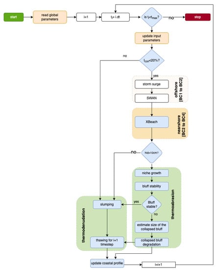 APA StyleIslam, M. A., & Lubbad, R. (2022). A Process-Based Model for Arctic Coastal Erosion Driven by Thermodenudation and Thermoabrasion Combined and including Nearshore Morphodynamics. Journal of Marine Science and Engineering, 10(11), 1602. https://doi.org/10.3390/jmse10111602