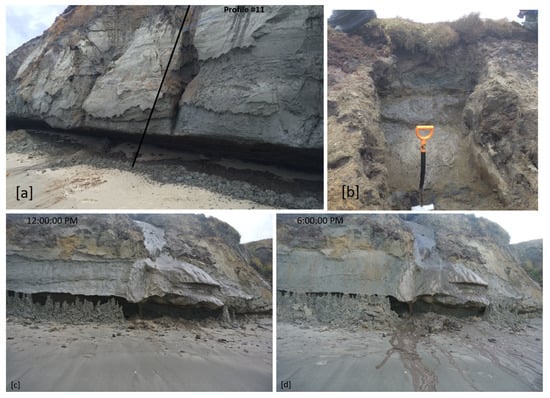 - The two consecutive bluff collapses routinely have an interval between them, and the time lapse between the two collapses is four to six weeks. The sediments released from the collapsed bluff alter the elevation near the swash zones, reducing the probability of inundating the beach with warm water and resulting in slow niche growth. The model by Ravens et al. [29] considered a numerical elevation of the beach by about 0.28 m to calibrate the model and achieve optimised calculation. In contrast, the model proposed herein assumes the sediment from the bluffs increases the elevation of the beach and the elevation is controlled by the morphodynamic module (XBeach).