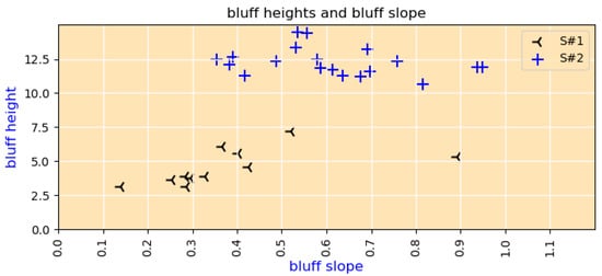 - The bluff height for case#1 is 6 m, and for case#2 is 13 m. The bluff slope of case#1 is approximately 0.4, which is lower than the bluff slope of case#2 (0.9).
