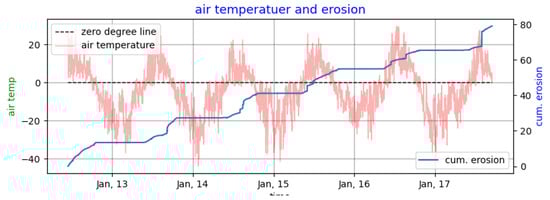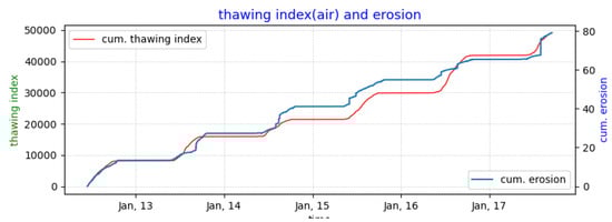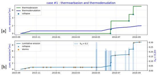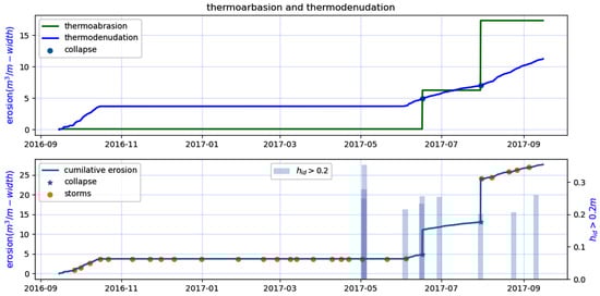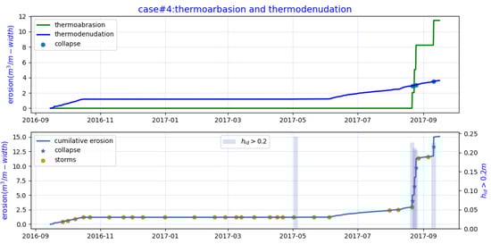 - Erosion during the winter is negligible or absent. Barnhart et al. [30] concluded in their model that low erosion occurs at the end of summer and beginning of fall for the coast of Alaskan Beaufort Sea whereas our numerical model for Baydaratskya Bay in Kara sea simulates higher erosion at the middle and end of summer.