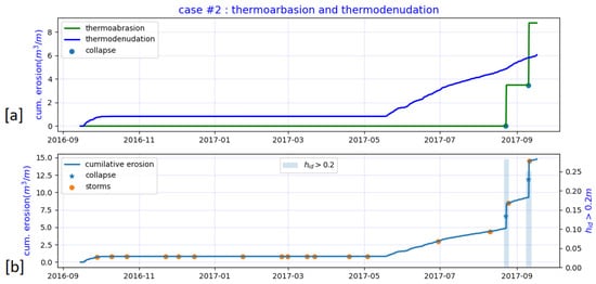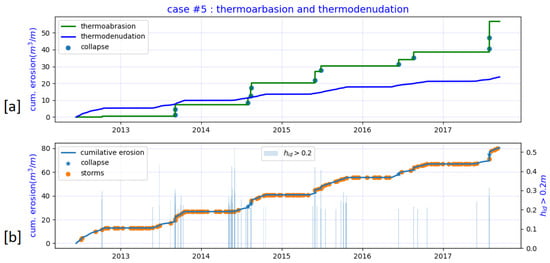 - The results of the numerical model suggest that thermoabrasion is a complex process and does not demonstrate a linear relation with the intensity of storms. In other words, the strongest storm does not necessarily lead to a collapse. A bluff collapse by a wave-cut niche results from a combination of the nearshore beach profile, storm surge duration, water temperature, and bluff geometry. A similar observation was made by Barnhart et al. [30] for the thermoabrasion numerical model of the Alaskan Beaufort coast.