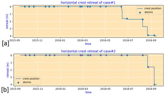 - The crest retreat for case#1 is 4.1, which is larger than that of case#2, even though the erosion volume of case#1 is lower. Because of the higher bluff heights (13 m vs. 6 m) for a similar crest retreat, case#2 had higher erosion volume.