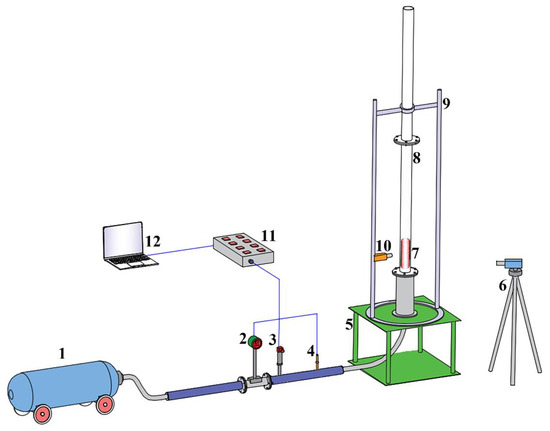 Experimental apparatus. (1) ZV-3/10 air compressor; (2) LK-VFF-50 flow meter, 1.5% FS; (3) MIK-P300 pressure sensor, 0.2% FS; (4) Pt-100 temperature sensor; (5) base frame; (6) YVSION/OSG030-815UMTZ high-speed camera; (7) polypropylene cylinder; (8) plexiglass pipe; (9) support frame; (10) light; (11) data collection box; (12) computer.