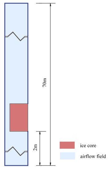 The ice core’s maximum velocity, , can be determined by the suspension velocity, , of the ice core. In the following, the suspension velocity of the ice core is solved by CFD simulation. When the ice core is suspended, the velocity of the ice core is zero, and the aerodynamic force is equal to the buoyant weight.