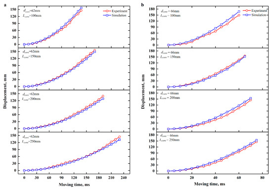 Comparison of experimental and simulated results of ice core motion: (a) Ice core diameter of 62 mm; (b) Ice core diameter of 66 mm.