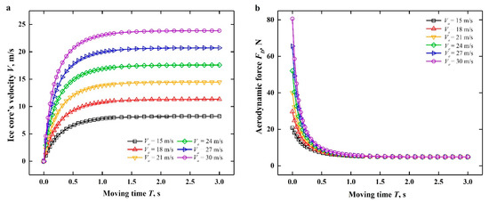 The ice core is subject to aerodynamic force because its motion is slower than the air’s motion, and there is a slip velocity between them. As seen in Figure 6b, the aerodynamic force is most significant at the initial instant because the relative velocity between the ice core and the air is most significant. As the air velocity rises from 15 m/s to 30 m/s, the aerodynamic force rises from 20.82 N to 80.59 N. After starting up, the ice core’s velocity increases quickly as the aerodynamic force sharply declines. Regardless of the air velocity, it is eventually reduced to the ice core’s buoyant weight and stays that way.