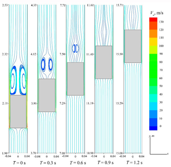 Due to the limitation of the pipe wall, the airflow cross-section around the ice core varies dramatically during transport, and the flow field properties also vary significantly. Figure 7 displays the streamline pattern surrounding the ice core at various times. The ice core is still at the start of the process. All streamlines are forced up against the pipe wall when they enter the annulus region once the flow from the pipe reaches the lower end of the ice core. After the ice core moves, some streamlines follow it forward, while others flow toward the annulus area. The airflow segment abruptly expands at the annulus’s exit, and as it moves ahead, a portion of the airflow turns around to backfill the surrounding region above the ice core, creating a vortex zone. The presence of the vortex zone creates a differential pressure force between the upper and lower ends of the ice core. As time passes, the ice core’s velocity rises steadily, the airflow following the movement of the ice core rises, the airflow flowing into the annular region falls, and the vortex area shrinks.