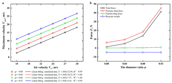 The effect of the ice-core-to-pipe diameter ratio on the ice core’s maximum velocity, Vmax, at various air velocities is shown in Figure 8a. As air velocity and diameter ratio rise, the value of Vmax also rises. For a diameter ratio of 0.84, when the air velocity rises from 15 m/s to 30 m/s, the value of Vmax rises from 5.32 m/s to 21.04 m/s. For the air velocity of 21 m/s, when the diameter ratio increases from 0.80 to 0.92, the value of Vmax increases from 8.92 m/s to 17.45 m/s. It can be seen from the fitting curve that the maximum velocity, Vmax, and the air velocity satisfy the linear equation.