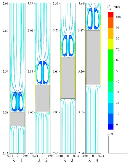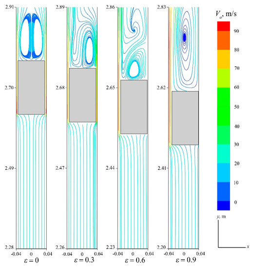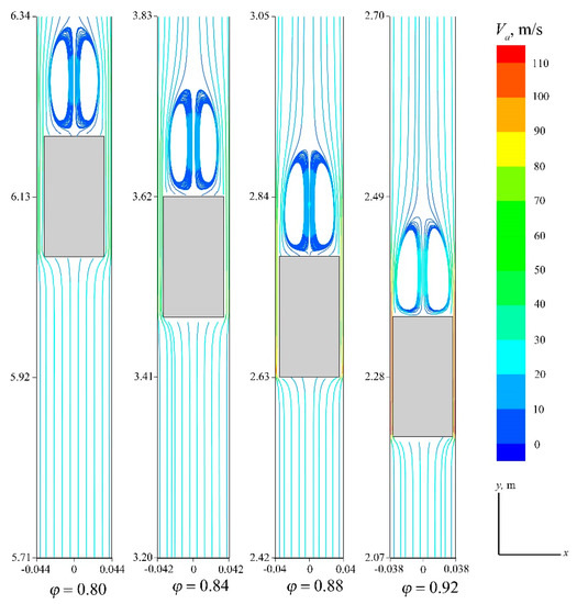 At this time, the streamline pattern near the ice core is shown in Figure 9. When the diameter ratio increases, the gas velocity in the annular space and the vortex zone increase, resulting in a decrease in the pressure in the vortex zone and an increase in the differential pressure force. Therefore, with the increase in the diameter ratio, the aerodynamic force on the ice core increases.