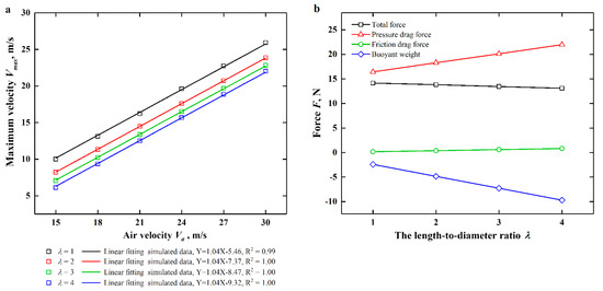 The effect of the length-to-diameter ratio on the ice core’s maximum velocity, Vmax, under various air velocities is shown in Figure 10a. The value of Vmax increases as air velocity increases and increases as the length-to-diameter ratio decreases. When the air velocity increases from 15 m/s to 30 m/s for the length-to-diameter ratio of 3, the value of Vmax increases from 7.06 m/s to 22.81 m/s. When the length-to-diameter ratio increases from 1 to 4, the value of Vmax decreases from 16.22 m/s to 12.50 m/s for the air velocity of 21 m/s. The ice core’s maximum velocity, Vmax, and the air velocity satisfy the linear equation, as seen from the fitting curve.