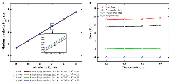 The effect of the eccentricity on the ice core’s maximum velocity, Vmax, under different air velocities is shown in Figure 12a. The value of Vmax increases with the increase in air velocity and eccentricity, but the eccentricity has little effect on the value of Vmax. For the air velocity of 24 m/s, when the eccentricity increases from 0 to 0.9, the value of Vmax increases from 17.59 m/s to 17.81 m/s.