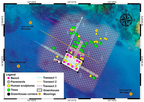 Location of underwater sculptures and 3 × 50 m transects at Coral Greenhouse site.