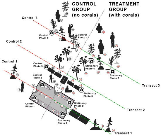 Coral Greenhouse layout showing sculpture locations, transect locations, stationary point photo locations and transplantation sites for treatment and control locations. Numbers in red are locations for coral planting and monitoring. Numbers in black are locations for control (no coral planting).