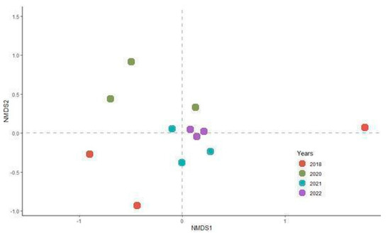 Non-metric multidimensional scaling (NMDS) using Bray-Curtis dissimilarities of fish community on permanent transects at MOUA from 2018 to 2022 (2D stress value = 0.08).