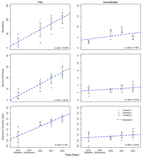 Linear regression coefficient analysis on fish species showed a significant positive increase of abundance, species richness, and diversity with respect to time (Figure 7). Overall time had a significant effect on the biodiversity of fish species (Table 4).