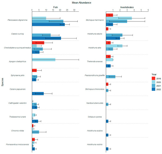 Mean abundance across three transects of fish (left) and macroinvertebrate (right) species ordered by species with highest representation across 2018–22. The 10 species with the greatest representation are displayed.