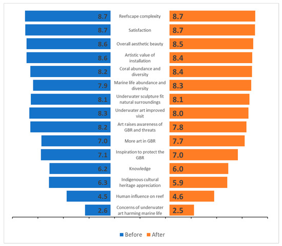 Planting corals onto the structure marks potential changes to the aesthetics of the Coral Greenhouse. To assess how coral planting on the museum affects visitor experience and aesthetic value of the Coral Greenhouse, we conducted a coral reef aesthetic survey pre- and post-planting of corals. A total of 142 surveys were taken before and 94 surveys were taken after coral planting at the Coral Greenhouse, respectively. The survey questionnaire has a series of questions, including 15 statements for participants to rate between 1–10 based on their level of agreement with the statement (10 = Strongly Agree, 1 = Strongly Disagree) (Figure S1) [27]. Responses were collected on regular tourism trips to John Brewer Reef.