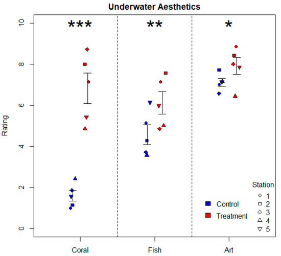 Underwater aesthetic surveys showed significantly higher scores on the treatment of half of the museum for corals, fish, and art. This expectedly resulted in higher coral aesthetic values on the treatment half of the museum. Underwater aesthetic surveys for fish also showed that scores for treatment stations are significantly higher than control. The increased number of juvenile fish taking refuge on coral branches greatly affected the aesthetic value of treatment stations. Corals also improved the aesthetic value of art “giving life to the sculptures”. Aside from differences between treatment and control stations, we also observed that treatment stations 1, 2, and 3, where most corals were planted and more complex structures were installed, have higher scores than stations 4 and 5 with individual standing trees.