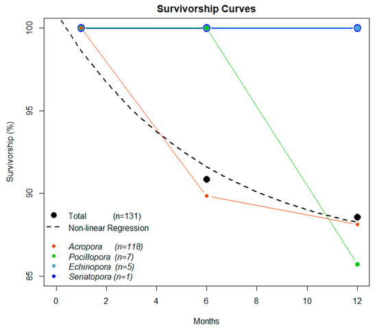 Out of 131 propagated corals, 90% were Acropora spp. (n = 118), while 10% were Pocillopora spp. (n = 7), Echinopora spp. (n = 5), and Seriatopora sp. (n = 1). Propagated corals were monitored for survival and health at 1, 6, and 12 months (Figure 11). All corals were alive and healthy after one month. At month 12, the observed coral transplants still showed a very high rate of 91.6% survivorship (n = 120). Dead or missing corals were Acropora spp. (n = 10) and Pocillopora sp. (n = 1). Of all remaining propagated corals, 93% were in good health (n = 112) and 7% were partially dead (n = 8).