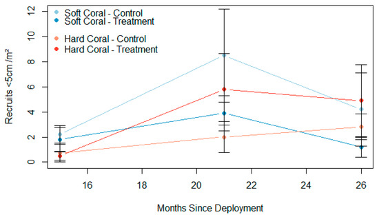 Coral recruits to artificial structures versus natural reef habitats have been shown to consist of differing recruit densities and community compositions over time [48,49,50]. Recruitment varies due to different structures and orientation, with, for example, steel structures resulting in lower invertebrate abundance and diversity than sandstone, Perspex, and wood [51]. Soft corals, which comprised over 55% of the total coral recruits surveyed, are early settlers on artificial reefs due to their extended breeding season, their asexual propagation techniques, and their ability to colonise a wider range of substrates [51,52,53]. Mean hard coral recruit density remained low, ranging from 2.8 to 4.9 hard coral recruits per m2. This was less than observed on natural reefs of the same reef complex, where a mean of 9.7 hard coral recruits per m2 was observed [54], differing from prior research, where artificial reefs experienced higher recruit densities than natural reefs in the first year of deployment [48]. This was less that the coral density of 6.0 ± 1.0 SE per m2 at eight months post construction, increasing to 24.0 ± 2.1 SE per m2 at 62 months post construction of the artificial concrete reef at Parker Point, Dampier, Western Australia [50]. While hard coral recruit densities remain lower than nearby natural observations, direct comparisons are difficult due to the different depth profiles. Natural reefs are monitored at between 6–9 m depth while the depth at the Coral Greenhouse is between 12–17 m. The underwater art provided an opportunistic settlement location advantageously selected by soft coral recruits. The number of recruits fluctuated with the highest abundance observed in September 2021. This may be due to the annual spawning cycles across the Great Barrier Reef for many reef corals, including the dominant Acropora spp. corals. With mass coral spawning occurring between October and December each year [54,55], there is a higher likelihood of coral recruits being more prominent in September than may be visible in March or February. Additionally, subsequent monitoring will be unlikley to include previous year’s recruits who have grown out of that size class.