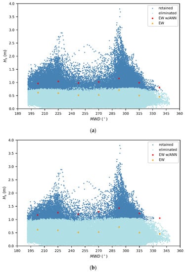 - A simulation set with the elimination of sea-states considered unable to initiate sediment motion by implementing the developed ANN to reduce the input dataset. This simulation set will be thereafter denoted as “EW w/ANN” and contains a representative sea-state for each dominant wave direction.