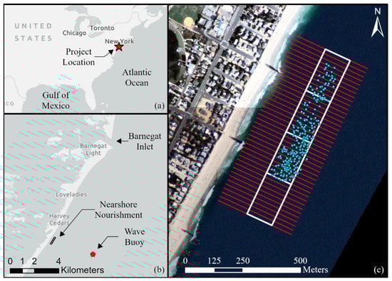 Harvey Cedars is a borough in Ocean County, NJ, USA, located along the barrier island of Long Beach Island approximately 110 km south of New York City, NY, USA (Figure 1a,b). Harvey Cedars has approximately 3 km of beach along the Atlantic Ocean. Wave Information Studies (WIS) hindcasts between 1976 and 1995 found Harvey Cedars had an average 0.9 m wave height and 6.4 s period from the southeast with most wave periods ranging from 5.0 to 9.0 s [41]. The site has a semi-diurnal tide range of 1.3 m [42]. A maximum wave height of 8.33 m and a 2% wave height of 3.22 m were recorded at the National Oceanic and Atmosphere Administration (NOAA) Station 44091 between 2015 and 2022 offshore of the project site. Harvey Cedars was selected to receive a nearshore nourishment because of an erosional hotspot identified along a stretch of shoreline within the Federal Coastal Storm Risk Management (CSRM) Project, which stretches for 26 km along Long Beach Island, NJ, USA. The Harvey Cedars beachfill portion of CSRM was originally completed in July 2010 [38] using 2.4 Mm3 of sediment, expanding the beach and burying a groin field (Figure 1c). Since that time, an emergency beachfill in 2013 used 1.2 Mm3 of sediment to repair damages to the beach and dune system after Hurricane Sandy, and 0.9 Mm3 of sediment was used for a periodic nourishment in 2018.
