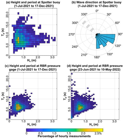Distribution of offshore and nearshore wave conditions. (a) Wave height and period at the Spotter buoy, 3 km offshore of the placement site. (b) Wave direction at the Spotter buoy. The concentric circles indicate the number of hourly events, and all angles are relative to north. (c) Wave height and period at the RBR pressure gauge for the same time period shown in subplot (a). (d) Wave height and period at the RBR pressure gauge for the entire monitoring duration.