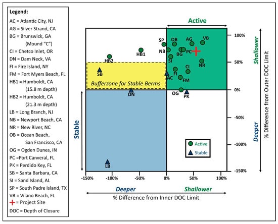 Relationship of the nearshore nourishment site to the Hallermeier depth of closure equations and compared to historical projects (adapted from McFall et al. [24] and Hands and Allison [20]).