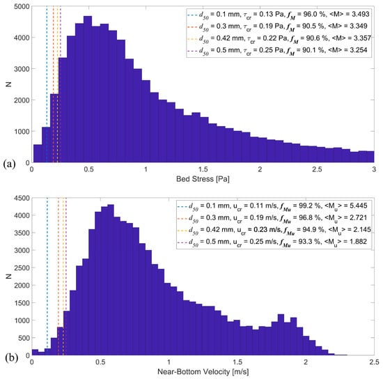 Histograms of the (a) bed shear stress and (b) near-bottom velocity calculated for the nearshore placement. The vertical dashed lines are the thresholds to initiate sediment mobility for the respective grain sizes.