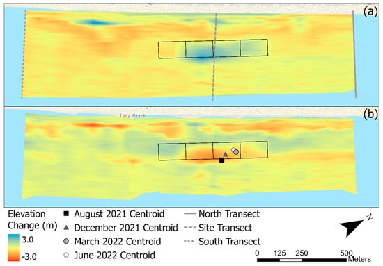 Change maps between pre- and post construction (a) and post construction and June 2022 survey (b). Within the placement area, the centroid of sediment was found and labeled for the surveys in August 2021, December 2021, March 2022, and June 2022.