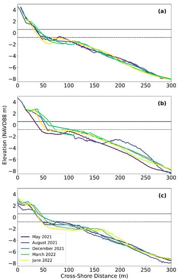 Beach profiles along the most northern transect (a), a transect within the placement area (b), and a transect south of the placement (c). MHHW (black solid line) is 0.61 m, and MLLW (black dashed line) is −0.79 m. The nearshore berm is seen in the August 2021 survey in (b) between 165 and 285 m.
