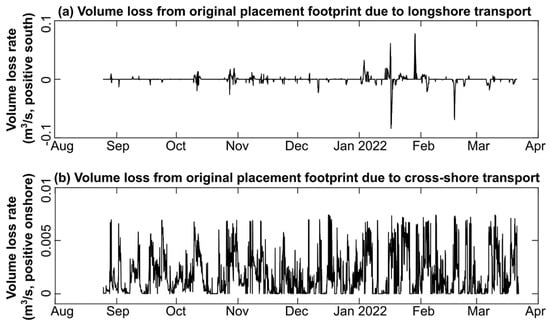 Time series of predicted volumetric sediment transport away from the original placement footprint based on the algorithm of Bain et al. [54]. In subplot (a), transport is directed alongshore towards the south when positive and alongshore towards the north when negative. In subplot (b), transport is directed onshore when positive and offshore when negative. Note that the cross-shore transport rate is for the entire shore-parallel length of the placement footprint (i.e., not unit width).