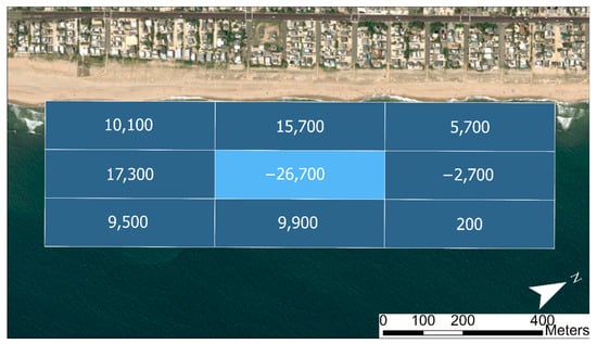 Bain et al. [54] validated their results for total (longshore + cross-shore) sediment removal from 11 historical placement sites but had insufficient survey data to evaluate whether the direction of predicted transport was accurate. To further evaluate the algorithm’s ability to accurately predict relative proportions of longshore versus cross-shore sediment removal from a placement site, a grid surrounding the placement area was created and used to divide the bathymetric survey data (Figure 8). The change in sediment volume within each quadrant was then calculated for each pair of consecutive surveys. Between placement and March 2022, 16,000 m3 of sediment accreted directly onshore, 9900 m3 of sediment accreted directly offshore, 3200 m3 accreted north of the placement and 36,900 m3 accreted to the south of the placement (Figure 8). The surrounding area gained 145% more sediment than the placement area lost, indicating sediment from the longshore transport was retained in the project area. The previously noted predicted deflation of the nearshore nourishment (65,400 m3) is coincidentally similar to the total volume gained in the areas surrounding the nourishment area (65,700 m3), but the volume gain accounts for processes not accounted for in the predicted deflation.