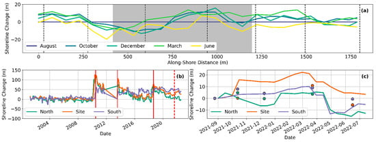 Change in mean shoreline extracted from the surveys (a), extracted shoreline from satellite imagery over the past 20 years (b), and comparing satellite extracted shoreline and survey extracted shoreline after construction (c). For the elevation surveys, shoreline change is relative to the post-construction August survey, groin locations are the dashed black lines, and the placement area is highlighted in grey. Previous subaerial beach nourishment projects are shown with solid red lines, with a dashed red line representing the 2021 nearshore nourishment (b), and DEM extracted shorelines are depicted as circles (c).