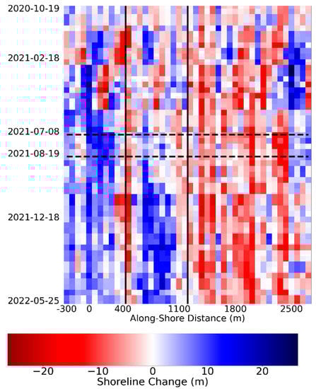 Change in raw shoreline extracted from the satellite imagery relative to the 3 October 2020 shoreline and normalized using the mean of all transects to remove tidal influences. The vertical solid lines show the along shore position of the nearshore nourishment, and the horizontal dashed lines frame the time of construction.