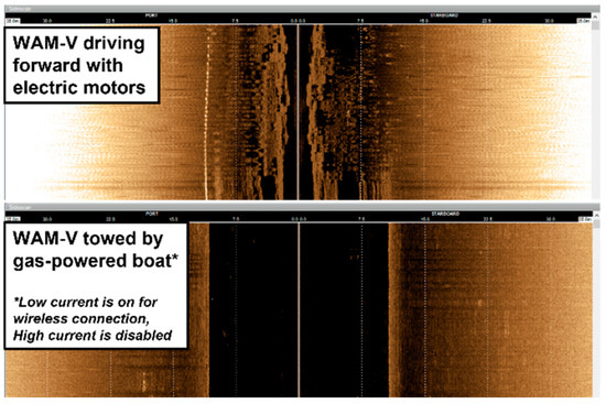 The results of the initial testing suggested that the electrical interference produced by the thrusters of a common USV overwhelmed a common side-scan sonar system without further mitigation. This was discovered by an additional test that evaluated if the interference appeared due to the proximity of a strong electric motor or the electrical and electronic interoperability to a battery-powered USV as shown in Figure 2.