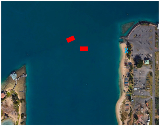 Figure 3. Satellite map of Sand Island. The red boxes represent the approximate locations where the mock UXO ladder was deployed. The blue X represents the approximate location of the ground station. - The ground floor foyer of Holmes Hall located on the University of Hawaii campus. This is a shaded area that allowed for in-air testing of the electric propulsion systems.