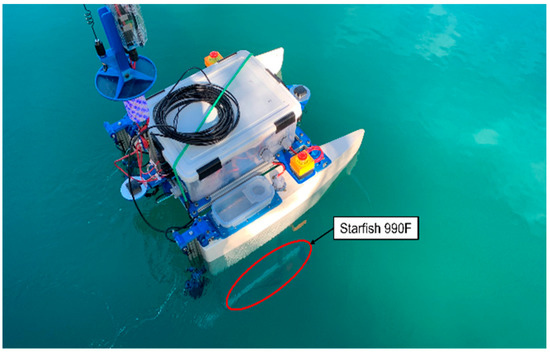Firstly, the Starfish 990F is a low-cost side-scan sonar that utilizes a 1 megahertz (MHz) acoustical compressed high-intensity radar pulse (CHIRP) to develop high-resolution images [15,16]. The sonar transducer is mounted to the underside of MRSUH or the WAM-V with an 80/20 aluminum frame. Sonar software allows operators to configure settings for the visualization of data, starting and stopping recordings, and exporting a comma-separated value file for postprocessing. One of the key features of this software is the plotter window. This window depicts the CHIRP returns as an instantaneous snapshot of the surface below the transducer as a function of time and may be altered to display data through a variety of color palettes. Due to the unmanned and remotely operated aspects of MRSUH and the WAM-V, Starfish 990F software was remotely configured, operated, and monitored remotely through a secure shell protocol.
