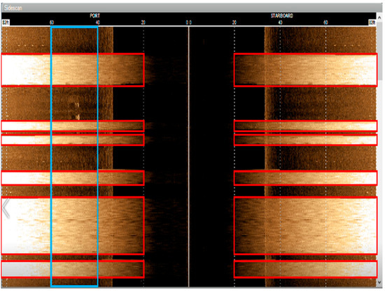 To quantitatively measure the effects of the changes, the RGB luminosity or perceived brightness of sections within the plotter window was used. As was shown in Figure 1, the electrical interference produced a relatively bright return compared to the sand bottom. Admittedly, “objects” also produced a bright return, but as seen in Figure 1, objects represented a small area compared to the noise [17]. Thus, we measured the brightness of each sonar image in specified areas of each image (red box in Figure 6). An image with more noise has a higher brightness. The images produced by sonar software were returned as color images. However, only the location and relative brightness contained any information. The color palette was simply a stylistic choice by the software operator. Thus, the perceived brightness was determined from the pixel RGB values [18]. The formula to measure the image brightness was based on the RGB values, as shown in Equation (1).