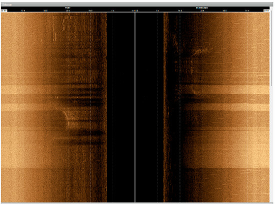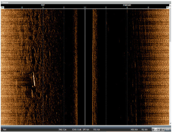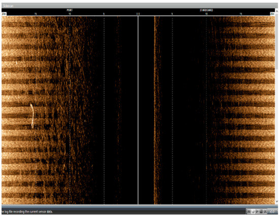 During initial testing, the direct integration, i.e., simply mounting the sonar to the USV, between a side-scan sonar and an existing USV did not yield a sonar image that allowed users to identify underwater features, as shown in Figure 1. A ladder-like group of four mock UXOs was deployed 5 m below the surface on a sandy bed. The side-scan sonar software was able to clearly display two objects. The other two mock UXOs in the ladder were obscured by bright bands of electrical interference that correlated with the energization of the USV’s electric propulsion motors.