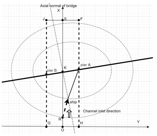 The method that we used to divide the active early warning system for ship–bridge collision avoidance is as follows: We selected point S on the x-axis to create OK = KS, going through S and drawing a line JF parallel to the y-axis. We crossed pier A and drew a straight line perpendicular to the y-axis, intersecting JF at point F and intersecting the y-axis at point H. Similarly, we crossed pier B and drew a straight line perpendicular to the y-axis, intersecting JF at point J and intersecting y-axis at point G., i.e., JFHG in Figure 2 is the active early warning range for the ship–bridge collision avoidance.