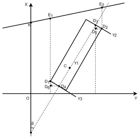 As shown in Figure 3, L is the ship length, Z is the ship width, and the position sensor on the ship is point C. The ship’s course over ground (COG) is the angle θ between due north and the heading direction of a ship (i.e., the ship’s sailing direction), α is the angle between due north and the x-axis (θ and α are not shown in the figure), β is the angle between the heading direction of the ship and the x-axis (i.e., ), D1 is the left posterior position point of the ship (the leftmost point), and D2 is the right anterior position point of the ship (the rightmost point).