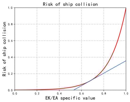 Figure 4 shows a graph of the ship–bridge collision risk that we created with Python. The red line is the curve of ship–bridge collision risk, and the blue line is the tangent of curve. According to the tangent of the graph, the risk change rate of the ship–bridge collision is large after the risk is 0.75. Therefore, we set the threshold of the early warning of the ship–bridge collision risk to 0.75.