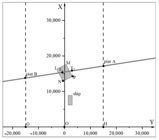 For all ships in the normal navigation area within the active early warning range of the active antiship collision avoidance, we took the Euclidean distance between each ship and the nearest pier (we took pier A as an example in this paper). We calculated the distances E1k and E2k from the E1 and E2 point to the K point on the channel centerline, and we calculated the distances E1A and E2A from pier A to the E1 and E2 point. According to E1(y1, x1), E2(y2, x2), K(0, xK), and A(ya, xa), the length of E1k, E2K, E1A, and E2A can be determined with Equations (13)–(16):