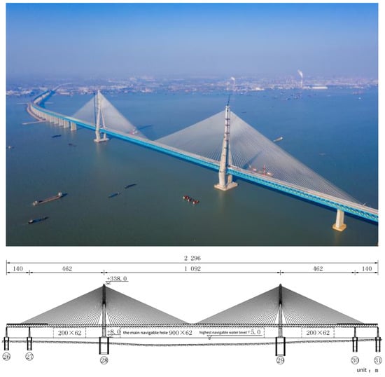 To effectively discuss the algorithm of the ship–bridge collision risk considering the ship’s dimension, we tested our algorithm with the Shanghai–Nantong Railway Yangtze River Bridge. The Shanghai–Nantong Railway Yangtze River Bridge connects the cities of Suzhou and Nantong in Jiangsu Province, China, with a total length of 2296 m and a main span of 1092 m. The single-hole two-way span of the main navigation hole channel of the bridge is 900 m, as is the navigation clearance width. The Shanghai–Nantong Railway Yangtze River Bridge plan is shown in Figure 6 [].