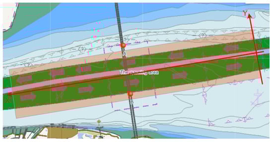 The selected channel range that we studied is shown in Table 1. We established a rectangular coordinate system, including the origin, channel direction, and selection range. The longitude and latitude of the two piers of the main channel of the bridge were A (120.713044 E, 32.009569 N) and B (120.714733 E, 31.999814 N), respectively.