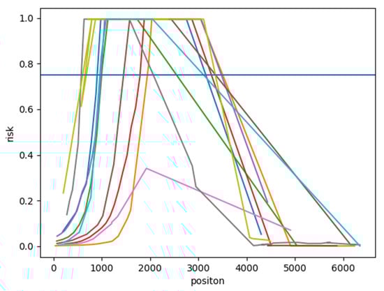 Figure 8 is the curve diagram of the ship trajectory points and maximum risk, which we created with Python. The horizontal blue line indicates that the risk of collision is 0.75. And different colored lines indicate different ships. As can be seen from the curve diagram, when the risk of a ship–bridge collision is 0.75 or above, alarm intervals are present in the active warning system for ship–bridge collisions. When the risk of a ship–bridge collision is lower than 0.75, the ship can safely sail.