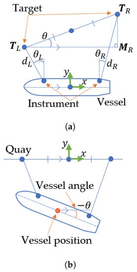 This section explains the calculation of the positional relationship between a vessel and its quay while berthing. As shown in the vessel-based coordinate system in Figure 3a, each distance-measuring instrument installed on the bow and stern of the vessel measures the distances and to each target installed on the quay side and the respective angles and of the direction to that target. The positioning estimation of the vessel is obtained by transforming the calculated data between each measuring instrument and the target based on the coordinates in Figure 3a to that of the quay-based coordinate system shown in Figure 3b. Therefore, the angle between the line connecting the two targets and the line parallel to the quay inside the vessel, as shown in Figure 3a, can be obtained from Equation (1) using the coordinates and of the two targets on the quay side. Thus, the attitude of the ship, as seen from the quay, is related to Equation (2). To simplify the coordinate system, the coordinate values of the distance-measuring instruments are placed on the centerline of the vessel [2].